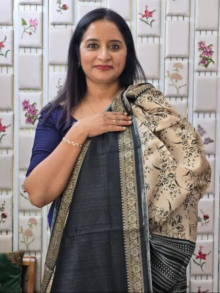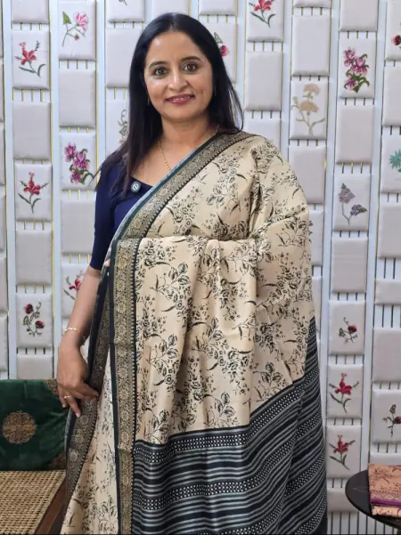 BEIGE AND BLACK COLOUR CHANDERI SAREE WITH FLORAL PRINTS AND ZERI BORDER