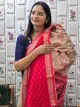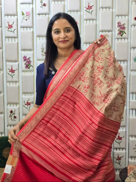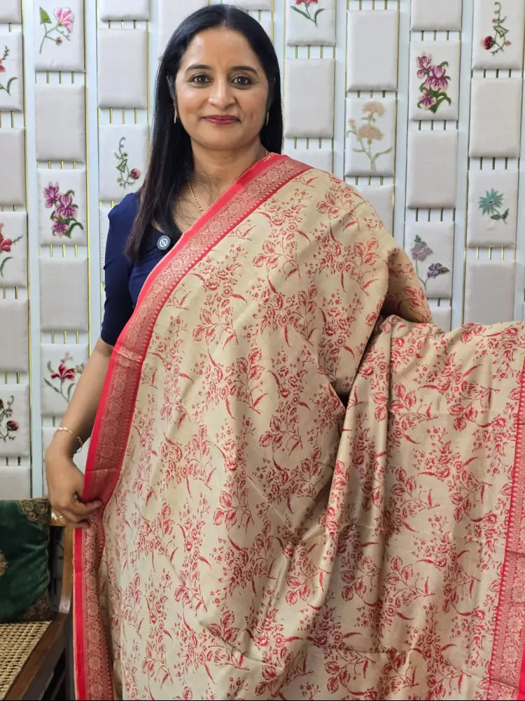 BEIGE AND CORAL RED COLOUR CHANDERI SAREE WITH FLORAL PRINTS AND ZERI BORDER