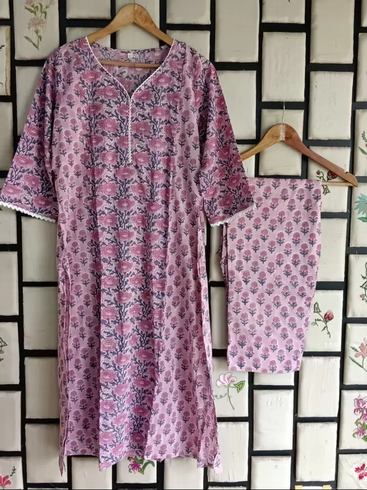 Beautiful and casual cotton handblock printed top and bottom [ NB: Its done with organic supplements, so first wash should be dry cleaning ]