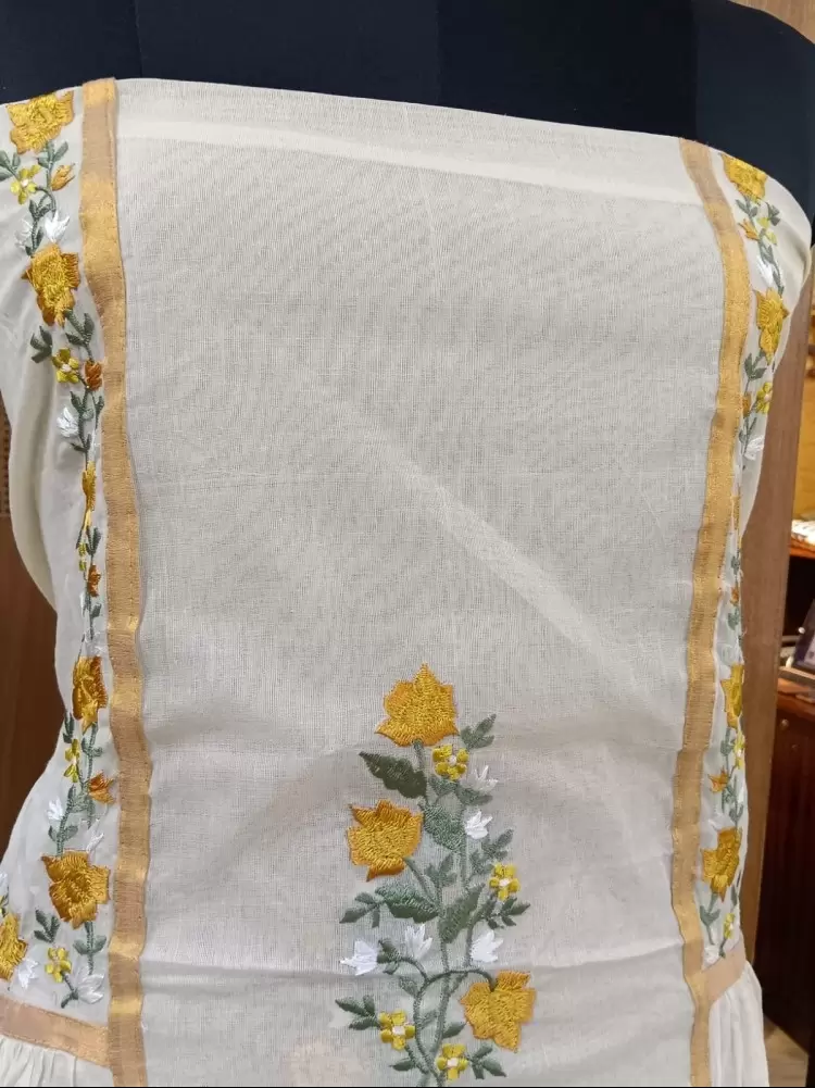 We are introducing our pretty 'ONAM' collection named 'BANDHI JAMANDHI' is comes in beautiful traditional Kerala cotton kurthi done beautiful hand paint, appliqués and embroidery and golden zari at the edges