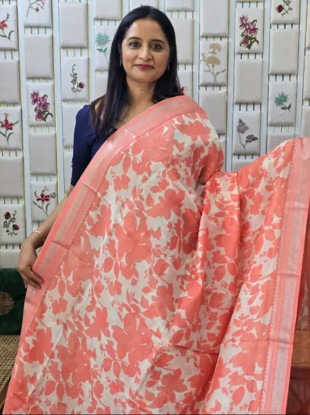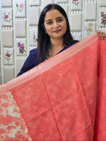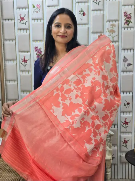 PEACH COLOUR CHANDERI SAREE WITH FLORAL PRINTS AND ZARI BRODER